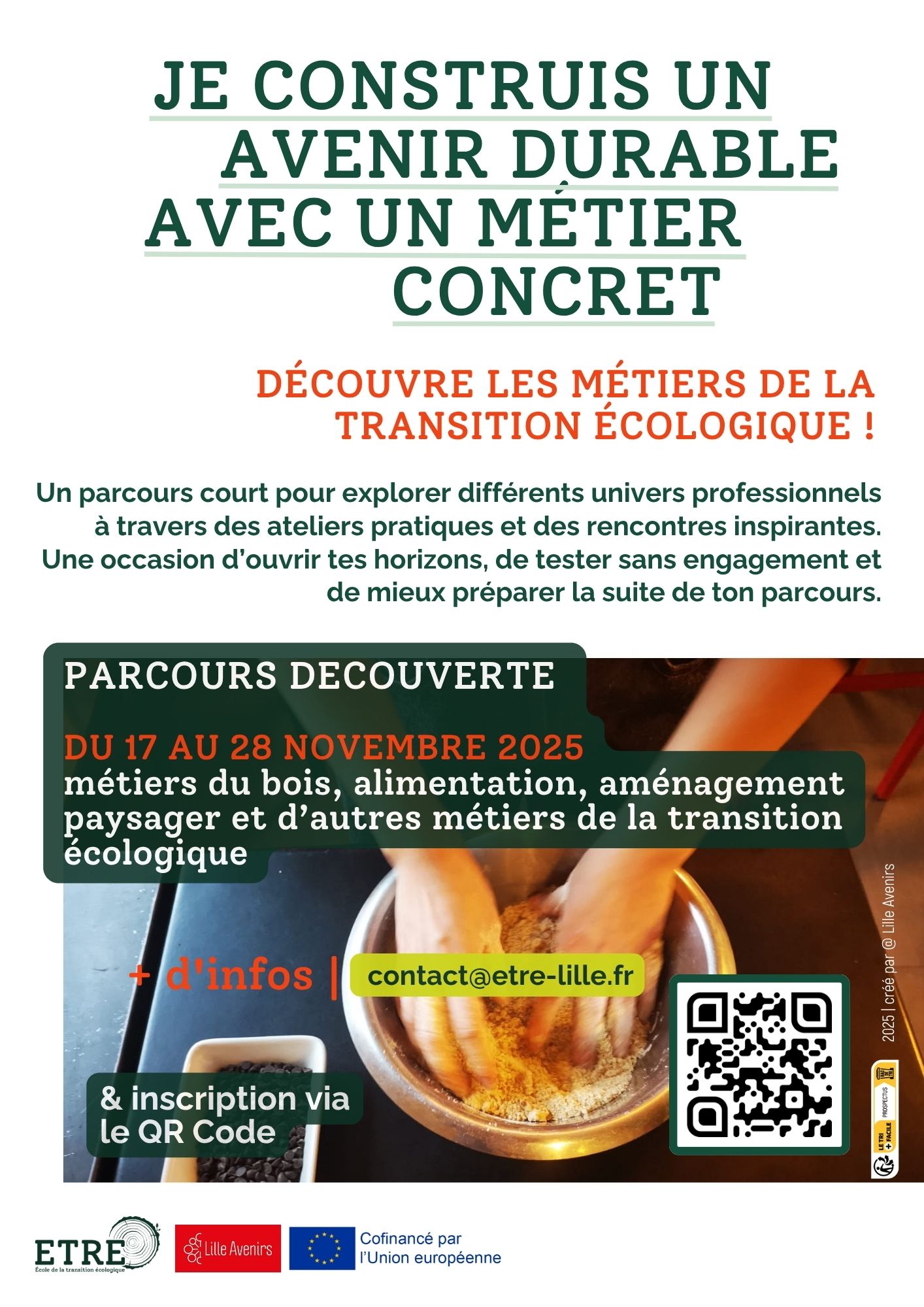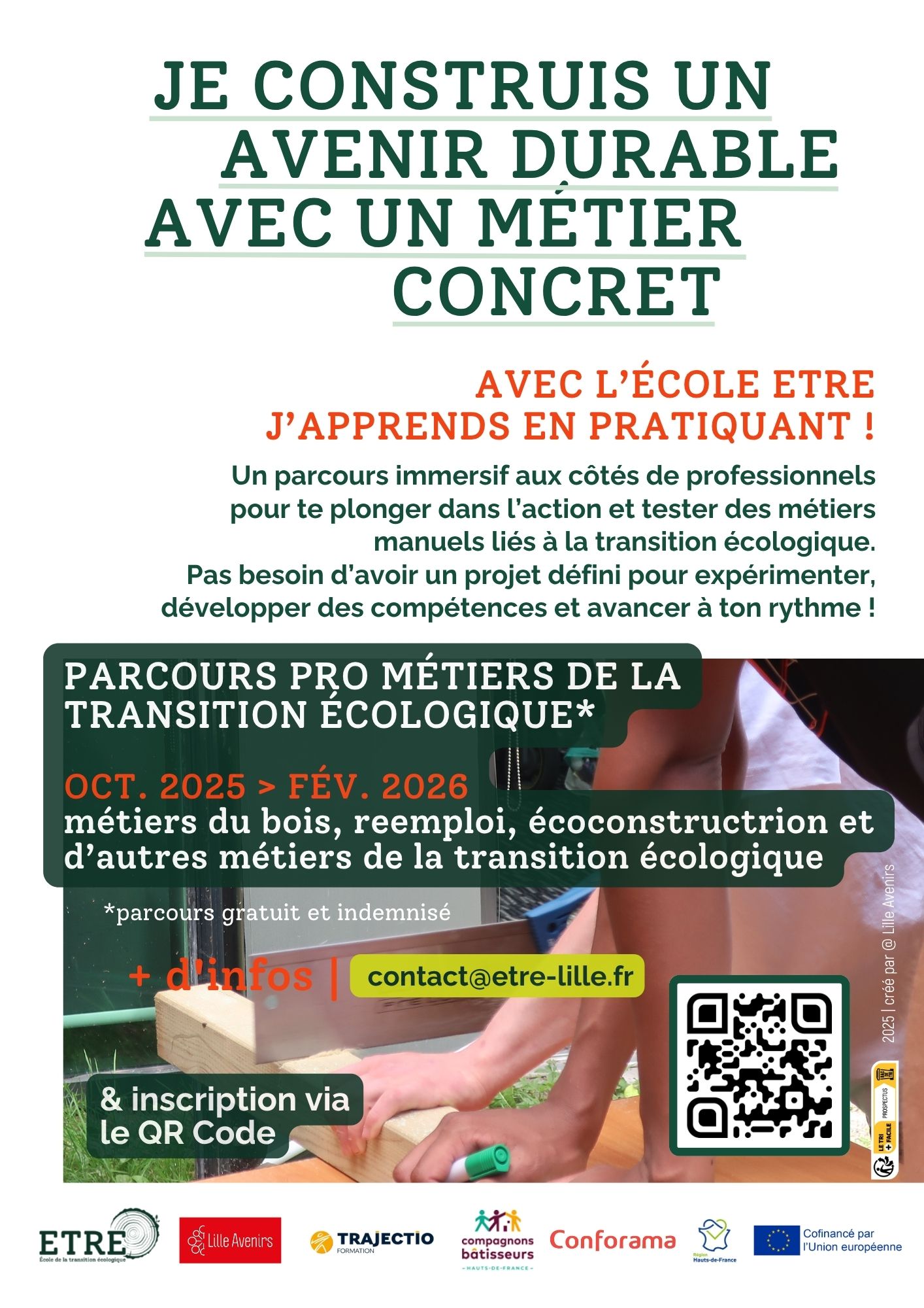 Gratuits et centrés sur la mise en pratique, les parcours proposés associent accompagnement personnalisé, de découverte et préqualification dans des secteurs d’avenir : réemploi, agriculture urbaine, écoconstruction, bois, alimentation durable, métiers du paysage, recyclage et énergies renouvelables.